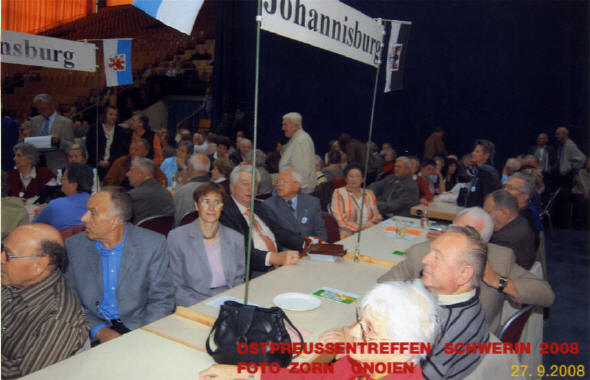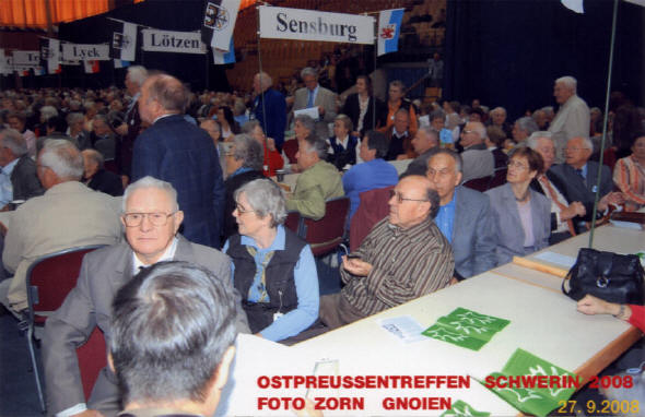 Die anschließende Festansprache hielt der stellvertretende Sprecher der Landsmannschaft Ostpreußen, Dr. Wolfgang Thüne, vielen noch als „ZDF-Wetterfrosch“ bekannt. Der Redner ging vor allem auf das deutsch-polnische Verhältnis, seine Vorgeschichte und die aktuellen Schwierigkeiten ein, so im Blick auf das Zentrum gegen Vertreibungen in Berlin. Dort ist Polen ausdrücklich zur Mitarbeit eingeladen, und auch der polnischen Vertreibungsopfer soll dort eigens gedacht werden. Die feierliche Stille in der riesengroßen Halle, in der die am Rand Sitzenden den Redner kaum sehen konnten, zeugte von der Bereitschaft des Hörens dieser Botschaft. Als Gäste und gleichzeitig Auftretende waren aus Ostpreußen die folgenden Chöre beziehungsweise Singgruppen eingeladen: „Heide“ aus Heydekrug, „Lied der Heimat“ aus Memel, „Stimme der Heimat“ aus Lötzen, „Masurenklang“ aus Peitschendorf Kreis Sensburg und „Warmia“ aus Heilsberg, ferner das Jugendensemble „Tannen“ aus Osterode und die Tanzgruppe „Saga“ aus Bartenstein. Diese rund 130 geladenen Gäste wurden durch den Veranstalter in der Jugendherberge Güstrow untergebracht und beköstigt. Heimatsänger „BernStein“ moderierte das vielfältige ostpreußische Kulturprogramm wieder hervorragend und bereicherte es durch eigene musikalische Beiträge. Die Ausgabe des preiswerten Mittagsessens und der verschiedenen Getränke sowie die Bewirtung mit Kaffee und Kuchen waren bestens durchorganisiert und klappten trotz des massenhaften Ansturms wie am Schnürchen. Besonders erwähnenswert sind die Stände des BdV Anklam mit Heimatbüchern, Landkarten und Bärenfang, deren Rekordumsätze in die Finanzierung des Treffens fließen, sowie der Handarbeitsstand der ostpreußischen Frauengruppe Schwerin, vor allem jedoch die tüchtige Helferschar aus Anklam und Neubrandenburg. Die Ostpreußen aus dem Norden Deutschlands, bis weit über Hamburg hinaus und aus der Gegend Berlins herkommend, freuten sich bereits während ihrer Abreise auf das Wiedersehen beim nächsten Landestreffen in Mecklenburg-Vorpommern am 3. Oktober 2009 im Jahn-Sport-Forum Neubrandenburg. - Buchholz / Schülke