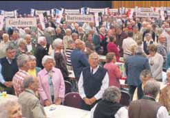 Trotz des starken Nebels, der sich in den frühen Morgenstunden auf allen Zufahrtsstraßen in Richtung Landeshauptstadt ausbreitete, strömten die Ostpreußen und ihre Freunde bereits seit der Öffnung der Sport- und Kongreßhalle ununterbrochen dem Eingang und somit der festlichen Großveranstaltung entgegen. Die annähernd 2000 Besucher füllten alsbald alle Plätze an den langen Tischen mit den 40 großen Schildern aller ostpreußischen Kreisstädte, so daß auch die oberen Ränge geöffnet werden mußten. Schon der Einzug der Fahnenträger mit fast allen Heimatfahnen der Kreise unter musikalischer Begleitung des Landespolizeiorchesters bewirkte eine erhabene und bewegende Atmosphäre. Das Landestreffen wurde von Manfred Schukat eröffnet, der alle Landsleute und Ehrengäste herzlich in Schwerin willkommen hieß und die Ostpreußen als große Familie bezeichnete, die in Freude und Leid zusammenhält und der Heimat treu bleibt. Daß kein Vertreter der Landesregierung trotz freundlicher Einladung gekommen war, erregte allgemeines Mißfallen. Über Politikverdrossenheit muß man sich dann nicht wundern.