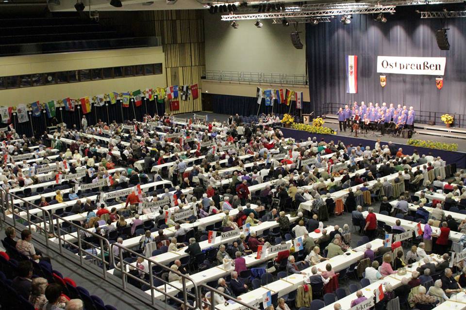 Rostock. – Weithin sichtbar grüßten große Ostpreußenfahnen vor der Stadthalle die 2.000 Besucher des 19. Landestreffens der Ostpreußen am 27. September 2014. Diese landesweite Veranstaltung findet seit 1996 im jährlichen Wechsel auch in Schwerin und Neubrandenburg statt – in Rostock nun zum 7. Mal. Die Organisatoren hatten kräftig eingeladen und alles gut vorbereitet. 40 Helfer aus Anklam, Rostock und Neubrandenburg sorgten für einen reibungslosen Ablauf. Mit Bussen reisten wieder ganze Heimatgruppen an, viele Autos reihten sich auf den Parkplätzen, einige sogar aus Hamburg, Kiel, Leipzig, Köln und Stuttgart. So füllte sich die große Stadthalle bis zum letzten Platz und hinauf zu den Rängen. Ganz selbstverständlich strebten die Besucher ihren Tischen zu, die jeweils mit großen Tafeln aller 40 ostpreußischen Heimatkreise ausgeschildert waren - von Memel bis Neidenburg, von Elbing bis Goldap. Dazu lagen Besucherlisten aus, die das Auffinden anhand der Eintragungen erleichterten. Die weiteste Anreise mit 85 Jahren hatte Gerhard Weiss aus Swakopmund / Namibia, der bis 1948 bei Laukischken / Kreis Labiau lebte. Wie er nahmen 300 Gäste erstmals an diesem Landestreffen teil. Radio M-V und das NDR-Nordmagazin sendeten jeweils kurze Berichte.