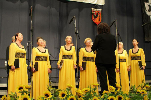 Noch am Vormittag eröffnete der russische Kant-Chor Gumbinnen in festlichen Kostümen das ostpreußische Kulturprogramm mit deutschen und russischen Chorälen. Die Gastronomie der Halle war auf die Mittagspause gut gerüstet; die Königsberger Klopse waren schmackhaft und preiswert. Dicht umlagert wurden auch die Anklamer Verkaufsstände mit Heimatbüchern und Landkarten. 6.000 kleine und 300 große Flaschen Bärenfang wurden umgesetzt und damit ein Teil der Unkosten bestritten. Den Nachmittag moderierte Heimatsänger Bernstein. Erstmals trat das Mecklenburg-Pommeraner Folkloreensemble Ribnitz-Damgarten bei den Ostpreußen auf. 50 Kinder, Jugendliche und Erwachsene begeisterten die Besucher eine Stunde lang mit den schönsten Volkstänzen der Region. Aber auch die deutschen Vereine aus Ostpreußen hatten kurze Programme einstudiert. Mit Chorliedern und dem Gumbinner Tanz grüßten die Landsleute aus Heydekrug und Memel, Lötzen und Heilsberg. Viel Applaus erhielt auch die Tanzgruppe SAGA aus Bartenstein in ihren ostpreußischen Trachten. Zuletzt brachte der Shanty-Chor „De Klaashahns“ aus Rostock die Stimmung zum Überlaufen. Zu den schönen Liedern von Heimat und Meer bildete sich eine endlose Polonaise durch den Saal, der sich spontan viele begeisterte Landsleute anschlossen. Die meisten Besucher blieben daher bis zum Großen Finale. Sämtliche Mitwirkende auf der mit leuchtenden Sonnenblumen üppig geschmückten Bühne stimmten noch einmal gemeinsam mit den Gästen das Ostpreußenlied an und reichten sich zum Zeichen der Verbundenheit die Hände. Manfred Schukat dankte allen fleißigen Helfern und lud die Ostpreußen zum 20. Landestreffen in der Kongresshalle Schwerin am 26. September 2015 ein. Für das nächste Jahr sind auch wieder zahlreiche Heimatfahrten geplant. So ging ein Tag zu Ende, der den Ostpreußen viel gegeben hat: Große Wiedersehensfreude, neue Kontakte und viele Anregungen. Messen und zählen lässt sich das sicher nicht - es war einfach wieder nur schön.