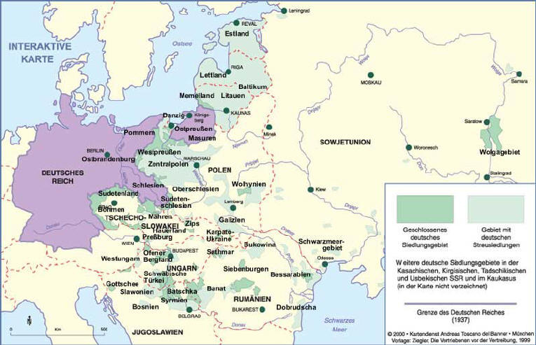 Siedlungsgebiete der Deutschen in Mittel- und Osteuropa (Stand: 1937) Durch berühren einzelner Standorte erhalten Sie weitere Informationen