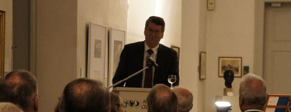 Kulturzentrum Ostpreußen feiert 30-jähriges Bestehen Ellingen (Bay). Ein Festakt in würdigem Rahmen fand am 25. Oktober im Kulturzentrum Ostpreußen statt: gemeinsam mit Vertretern der Bundes- und Landesregierung feierte die Landsmannschaft Ostpreußen das 30-jährige Jubiläum der Einrichtung. Regierungsdirektor Dr. Frank Schilling, der Beauftragte der Bundesregierung für Kultur und Medien, erläuterte vor den geladenen Gästen, wie wichtig aus der Sicht der Bundesregierung die Bewahrung des ostdeutschen Kulturerbes sei, und zwar nicht nur, um diese Gebiete nicht in Vergessenheit geraten zu lassen, sondern auch, um historische und kulturelle Zusammenhänge verstehen zu können. Ministerialdirigent Paul Hansel vom Bayerischen Sozialministerium (Foto) überbrachte die Grüße von Ministerin Christine Haderthauer (Grußwort zum Thema siehe PREUSSEN-KURIER Nr. 3/2011) und unterstrich, der Freistaat Bayern werde auch in Zukunft die Einrichtung finanziell und aktiv unterstützen, weil das Kulturzentrum nun einmal zu Bayern gehöre und Bayern sich als Kulturstaat verstünde. So wie die bayerische Kultur „unverwechselbar“ sei, so sei auch die ostpreußische Kultur „unverwechselbar“ – nur daß eben die Ostpreußen es heute unendlich viel schwerer hätten als die Bayern, ihre Kultur lebendig und unverwechselbar zu erhalten. So sei beispielsweise die ostpreußische Mundart im Aussterben begriffen, weil die Träger dieses Dialektes eben auch langsam ausstürben. In dieser Situation wolle Bayern alles tun, um den Ostpreußen beim Erhalt dessen, was übrig und zu retten sei, behilflich zu sein. In ihren Grußworten betonten sowohl der Ellinger Bürgermeister Walter Hasl als auch der mittelfränkische Bezirkstagspräsident Richard Bartsch, welche Bedeutung das Kulturzentrum Ostpreußen in der Zeit seit seinem Bestehen für Stadt und Region erlangt hat. In einer kurzweiligen und von persönlichen Erinnerungen getragenen Ansprache schilderte Wilhelm v. Gottberg, der frühere Sprecher der Landsmannschaft Ostpreußen und nunmehr Vorsitzender des Stiftungsrates der Ostpreußischen Kulturstiftung, die Zeit von den Anfängen des Kulturzentrums bis heute. Er berichtete vom Entstehen der Idee, aber auch von Widerständen, vom Versuch der Politik, dem Zentrum die finanzielle Grundlage zu entziehen. V. Gottberg betonte aber auch, daß der Freistaat Bayern wie auch die mittelfränkische Bezirksregierung, Landkreis und Gemeinde sich stets ohne Wenn und Aber zu Ostpreußen und dem Kulturzentrum bekannt hätten. Diesen Institutionen sei es zu verdanken, wenn sich die Landsmannschaft Ostpreußen heute keine Gedanken um den Fortbestand der Einrichtung machen müsse. Für den Förderverein des Kulturzentrums sprach im Anschluß an die Festreden noch die Vorsitzende, Fürstin Wrede, einige Worte. Sie überreichte bei dieser Gelegenheit dem Direktor des Kulturzentrums, Wolfgang Freyberg, auch ein weiteres vom Förderverein erworbenes Exponat, einen Silberteller mit Bernstein-Einlegearbeit. Musikalisch umrahmt wurde der Festakt durch das Ellinger Barock-Ensemble „Flores musicales“, einem den Freunden des Kulturzentrums wohlbekannten Trio, das die Veranstaltung mit ausgewählten Sonaten von Schaffrath, Abel und C. Ph. E. Bach wie gewohnt auch musikalisch zu einem Hochgenuß werden ließ.