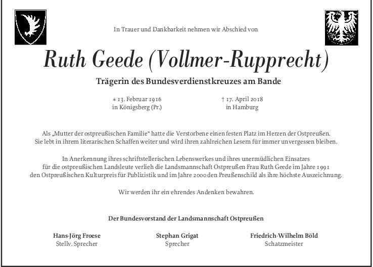 unermüdlicher Arbeit für die Ostpreußen ihre wohlverdiente Ruhe gefunden hat. Stationen eines arbeitsreichen Lebens Ruth Geedes Vita liest sich wie eine abenteuerliche Reise durch das vergangene Jahrhundert: Am 16. Februar 1916 erblickte sie mitten im Kriegswinter als Frühchen das Licht der Welt. Gerade einmal 36 Zentimeter maß sie und wog 2750 Gramm. Niemand hätte damals damit gerechnet, dass das „Saatkartoffelche“, wie ein Onkel sie scherzend nannte, einmal zu einer erfolgreichen Schriftstellerin heranwachsen würde. 1922 fand die erste Begegnung mit Agnes Miegel statt, als die kleine Ruth Geede ihren Vater, der als Quästor an der Königsberger Albertina arbeitete, in die Universität begleiten durfte. Sie sah die Dichterin im Säulengang der Albertina anlässlich der Verleihung der Ehrendoktorwürde an Agnes Miegel. Die Dichterin wurde Geedes Vorbild. Bei einer späteren Begegnung ermunterte Miegel das Nachwuchstalent zum Schreiben. Nach dem Krieg hielten sie Kontakt. Geede besuchte Miegel öfter an ihrem Wohnort Bad Nenndorf und schrieb die Laudatio zu deren 70. Geburtstag. 1933 durfte Ruth Geede, nachdem sie vorgesprochen und ein selbst geschriebenes Märchen eingereicht hatte, beim Reichssender Königsberg die „Kunterbunte Kinderstunde“ mitgestalten. Im gleichen Jahr wurde sie als jüngstes Mitglied in den Deutschen Schriftstellerverband aufgenommen, was als Ausnahme galt, denn das Mindestalter betrug 18 Jahre. 1934 hat Ruth Geede, erst 18 Jahre jung, ihre Karriere Autorin begonnen. Ihr erstes Buch „De Lävensstruuß“ schrieb sie mit 19. Es enthielt viele heitere und besinnliche Erzählungen. Von 1945 bis 1948 arbeitete Ruth Geede nach der Flucht aus Ostpreußen als Bibliothekarin, was sie aber nicht von ihrer großen Leidenschaft, dem Schreiben, abhalten konnte. In dieser Zeitspanne schrieb sie Schauspiele für Kinder und gab das Kinderjahrbuch „Das Karussell“ heraus. Sie setzte ihr schriftstellerisches Werk, das 1933 in Königsberg begonnen hatte, fort. 1948 hieß es zunächst, kleine Brötchen backen, als sie im niedersächsischen Dahlenburg einen Neuanfang als Volontärin bei der „Lüneburger Landeszeitung“ wagte, wo die gestandene Schriftstellerin das Journalisten-Handwerk „von der Pike auf“ lernen sollte. Viele Jahre später noch berichtete sie für die Zeitung aus Hamburg. 1955 heiratete sie, 38-jährig, den deutsch-chilenischen Exportkaufmann Guenter Vollmer-Rupprecht, den Sohn eines deutschen Kapitäns, der als Reise- und Wirtschaftsjournalist arbeitete. Gemeinsam mit ihrem Mann gründete sie einen Pressedienst, der zahlreiche Redaktionen mit Material „fütterte“. Unter anderem hatten sie sich mit dem „Frauendienst (fd)“ selbstständig gemacht. Es erschienen viele journalistische Arbeiten unter ihrem Ehenamen Vollmer-Rupprecht. Als Schriftstellerin verwendete sie jedoch weiterhin ihren Mädchenname Geede. Aus der Ehe ging der einzige Sohn Roderich hervor, der in die Fußstapfen seiner Eltern trat und den Beruf des Journalisten wählte. 1979 übernahm Ruth Geede die Rubrik „Ostpreußische Familie“ im Ostpreußenblatt von ihrer Vorgängerin Ruth Maria Wagner, die ebenfalls aus Königsberg kam. Sie war es auch, die ihre Kollegin Anfang der 50er Jahre zum Ostpreußenblatt gebracht hatte. Ursprünglich als eine Art Schwarzes Brett gedacht, entwickelte sich die „Familie“ zu einer wichtigen Institution, an die sich Suchende aus aller Welt wendeten. 1985 wurde Ruth Geede für ihre Verdienste das Bundesverdienstkreuz am Bande verliehen. Als 1989 ihr Mann Guenter viel zu früh verstarb, stürzte Ruth Geede sich noch intensiver in die Arbeit. 1991 erhielt die Journalistin als Auszeichnung für ihre Verdienste um Ostpreußen und die „Ostpreußische Familie“ im Rahmen des Deutschlandtreffens in Düsseldorf den Kulturpreis für Publizistik der Landsmannschaft Ostpreußen (LO). Das Motto des damaligen Deutschlandtreffens „Heimat verpflichtet“ sei auch Leitwort für die Arbeit von Ruth Geede, hob Volker Schmidt, Leiter der Kulturabteilung der LO, in seiner Laudatio hervor. Mit dem Preußenschild, der höchsten Auszeichnung der LO, wurde Ruth Geede während des Deutschlandtreffens 2000 in Leipzig geehrt. Nach Agnes Miegel und Frida Todtenhaupt war Ruth Geede die dritte Frau, die den Preußenschild erhalten hat. 2002 erhielt Ruth Geede die Goldene Ehrennadel des Deutschen Journalisten-Verbands (DJV). Ruth Geede – das sind 102 Jahre gelebtes Ostpreußen. Sie wird
