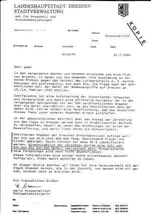 In der Presse der alten Bundesländer wurden diese Gedenkveranstaltungen lediglich durch kurze Meldungen erwähnt. Dabei wurde die Zahl der damals durch die alliierten Bomben umgekommenen Menschen mit lediglich 35.000 angegeben. Diese Zahl ist nachweislich falsch, wie heute jeder halbwegs zeitgeschichtlich informierte Bürger weiß; hat doch das Ordnungsamt der Landeshauptstadt Dresden Anfang 1993 auf Anfrage nach der Zahl der Opfer der Angriffe im Februar 1945 - wenige Wochen vor Ende des Krieges - durch das Amt für Protokoll und Auslandsbeziehungen (Bearbeiter: Mitzcherlich) mitgeteilt: "Gesicherten Angaben der der Dresdner Ordnungspolizei zufolge wurden bis zum 20. März 1945 202.040 Tote, überwiegend Frauen und Kinder, geborgen. Davon konnten nur etwa 30 Prozent identifiziert werden. Einschließlich der Vermißten dürfte eine Zahl von 250.000 bis 300.000 Opfern realistisch sein. Entsprechende Forschungen sind noch nicht abgeschlossen." Auch eine in Niedersachsen weitverbreitete Regionalzeitung hatte im Februar über die Gedenkveranstaltungen in der Elbestadt in einer kurzen Meldung berichtet. Natürlich auch mit den falschen Opferzahlen. Ein Leser stellte daraufhin in einem Leserbrief fest, daß. die von der Zeitung angegebene Zahl von 35.000 Toten falsch sei, wies auf die Aussage des Ordnungsamtes der Stadt Dresden hin und bat um Veröffentlichung dieser Zuschrift. Der Leserbrief wurde veröffentlicht, erhielt aber folgenden Redaktionsschwanz: „Anmerkung der Redaktion: Auf die Frage nach dem aktuellen Forschungsstand zitiert das Militärgeschichtliche Forschungsamt in Freiburg ein Standardwerk: 'Nach amtlichen Schätzungen kamen 35.000 Menschen ums Leben. Zwar dürfte die tatsächliche Opferzahl höher liegen, die sechsstelligen Angaben jedoch, die bald verbreitet wurden, entbehren jeder Grundlage.'" Daraufhin wandte sich der Leserbriefschreiber an das Militärgeschichtliche Forschungsamt in Freiburg und bat unter Hinweis auf die „Anmerkung der Redaktion” um eine Erklärung, warum einer Zeitung als falsch erkannte Zahlen der Opfer von Dresden durch das MFGA übermittelt würden. Der Antwortbrief verdient öffentlich festgehalten zu werden. Er lautet: "... in bezug auf Ihre Anfrage kann ich Ihnen mitteilen, daß unser ehemaliger Mitarbeiter Dr. Boog sich auf die als gesichert geltenden und wissenschaftlich nachprüfbaren Verlustzahlen der identifizierten Toten berufen hat. Anscheinend liegen aber neue Zahlen vor (Ordnungspolizei und Ia des Verteidigungsbezirks Dresden, Oberstleutnant Matthes), die von über 200.000 Opfern ausgehen. Leider ist eine Verifizierung dieser Zahlen durch MGFA aus personellen und arbeitstechnischen Gründen (Personalreduzierungen im Bereich der Bundeswehr / Verlegung MGFA nach Potsdam) auch auf weitere Sicht kaum möglich, so daß Sie sich anhand der wissenschaftlichen Diskussion und der entsprechenden Fachliteratur über diese Fragen informieren sollten. Unklar bleibt, warum man bis jetzt diese Zahlen zurückgehalten hat und wie man angesichts des Feuersturms und seiner Auswirkungen zu einigermaßen gesicherten Zahlen kommen will." Ein bemerkenswerter Brief eines Amtes der Bundeswehr. Er besagt, daß ein ehemaliger Mitarbeiter sich auf als gesichert geltende wissenschaftlich nachprüfbare Verlustzahlen berufen hat. Gleichzeitig wird aber mitgeteilt, daß das MFGA nicht in der Lage ist, gesicherte und dokumentierte Auskünfte beim Ordnungsamt der Stadt Dresden einzuholen, was jedem interessierten Journalisten bisher ohne Schwierigkeiten und ohne wesentliche Kosten gelungen ist. Dieser Brief ist nicht etwa von einer Sekretärin oder einem Schreibstubenfeldwebel unterzeichnet worden, sondern von einem Stabsoffizier, dem Oberstleutnant D. ... M. A. Von einem Stabsoffizier wurde in Preußen verlangt, daß er wissen mußte, wann er nicht zu gehorchen hatte. Dieser Stabsoffizier der Bundeswehr weiß das nicht. Er unterschreibt den o. a. Brief im Bewußtsein, daß seine Auskunft widersprüchlich ist. Man kann den Eindruck gewinnen, daß dieser Stabsoffizier an der geschichtlichen Wahrheit der Vorgänge im Zweiten Weltkrieg gar nicht so sehr interessiert ist. Er sieht seine Aufgabe scheinbar durch die Brille der reeducation (Umerziehung). Und diese sah vor, daß die Zahl der Bombenopfer in Dresden keinesfalls höher sein durfte als die Zahl der Toten in Hiroshima nach dem Abwurf der Atombombe auf Nichtkombatanten. Es sind seither 49 Jahre vergangen, und ' immer noch