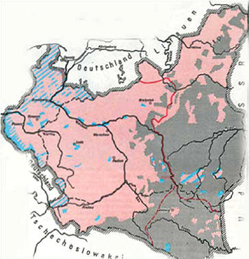 Zwischenkriegspolen: Gemäß polnischen Quellen lebten in dem Gebiet östlich der Curzon-Linie (rote Linie), das Polen der Sowjetunion als Beute des Krieges von 1920 nahm und das sich die UdSSR im Zweiten Weltkrieg zurückholte, nur etwa 1,5 Millionen Polen (zusammen mit Kaschuben und Masuren rosa), aber rund sechs Millionen Ukrainer und Weißrussen (zuammen mit Großrussen grau) und ungefähr 1,4 Millionen andere, unter anderem Deutsche (blau), vor allem jedoch Juden.