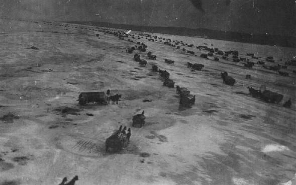 bombardiert worden war, dass die Trecks, die dadurch nicht mehr weiterziehen