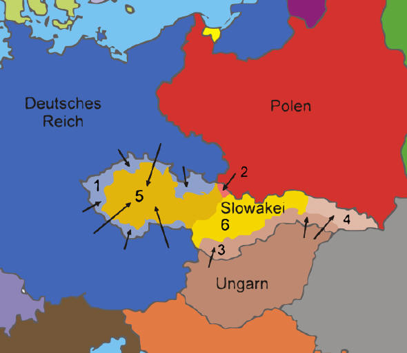 Schlecht für die Sudetendeutschen war die Weiterentwicklung: ein halbes Jahr später als Hitler am 15. März 1939 die „Resttschechei“ rechtswidrig besetzte: am 13. und 14. März hatten sich die Karpato-Ukraine und die Slowakei von der Fehlkonstruktion ČSR abgespalten. Hitler gründete das Protektorat Böhmen und Mähren wo eine tschechische Verwaltung unter deutscher Vorherrschaft entstand.