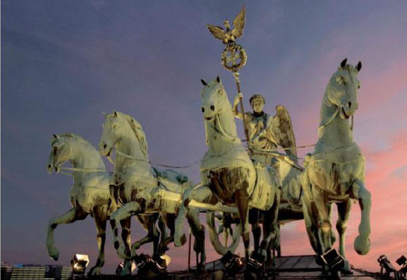 Das historische Kalenderblatt: 4. April 1814: Es ist gelungen, den von Kaiser Napoleon im Jahre 1807 von dort weggeführten Siegeswagen, nächst den Pferden hier wieder aufzufinden. Ich habe Sr. Majestät dem König von diesem Ereigniß sogleich Anzeige gemacht, und Sr. Majestät haben befohlen, daß die Zurückführung nach Berlin augenblicklich geschehen solle." Diese Nachricht, die "Marschall Vorwärts", Feldmarschall Gebhard Leberecht Fürst Blücher von Wahlstatt, vier Tage nach dem Einmarsch seines Königs Friedrich Wilhelm III. und dessen Verbündeter in Paris per Depesche aus der französischen in die preußische Hauptstadt sandte, erfreute nicht nur die Berliner und Preußen, sondern die ganze deutsche Nation. Dafür, daß der Rückkehr der Quadriga auf das Brandenburger Tor eine derart große Bedeutung beigemessen wurde, hatten die französischen Kunsträuber selber gesorgt. Der von Napoleon autorisierte Experte für den Kunstraub, der Directeur général des Arts Dominique Vivant Denon, hatte klar zu verstehen gegeben, daß "wenn endlich dies Werk", sprich die Quadriga, "auch nicht als ein Kunstwerk betrachtet werden sollte, so könne und müßte es doch als Trophäe dienen und gelten". Angesichts dieser Begründung gebot es schlichtweg die Selbstachtung, die "Trophäe" schnellstmöglich heimzuholen. Zeitgenossen formulierten es wie folgt: "O! Friedrich Wilhelm, diesen Wagen / Laß ja dem Feinde nicht! / Wir bitten drum, und müßten wir selbst tragen / Sein centnerschwer Gewicht / ... / O! komm, im Glanz von schönen Friedenstagen, / Und nochmals bitten wir: Vergiß ja nicht den Wagen!" Das war leichter gesagt als getan, denn die napoleonischen Kriege beendete im Gegensatz zu den beiden Weltkriegen ein Verständigungsfrieden, und die Franzosen verstanden es, die Rückgabe des geraubten Kunstgutes über Jahre, ja sogar Jahrzehnte hinzuziehen. Als im deutsch-französischen Krieg von 1870/71 die Museumsbestände und Archive neu gesichtet wurden, stellte man fest, daß das geraubte Kunstgut von Frankreich nie vollständig an Deutschland zurückgegeben worden war. Aufgrund des hohen Symbolgehaltes war die Rückgabe der Quadriga ebenso wie die des Degens Fried-richs des Großen für die Preußen jedoch keine Verhandlungsmasse, sondern eine Conditio sine qua non. Allerdings mußte vor ihrer Rückführung die Kriegsbeute erst einmal gefunden werden, denn die Franzosen hatten sie vorsorglich versteckt. Eine Pariserin soll hierbei, so eine Überlieferung, eine maßgebliche Rolle gespielt haben. Sie soll einem deutschen Soldaten das Versteck verraten haben und dafür von den Deutschen geehrt und von ihren Landsleuten als Verräterin hingerichtet worden sein. Nun konnte der Rücktransport beginnen. Damit etwas von dem Glanz der Quadriga auf ihn abfalle, ordnete der Preußenkönig an, daß der "Wagen heimlich in Berlin eingeholt" und dann zeitgleich mit seiner eigenen Rückkehr auf dem Brandenburger Tor präsentiert werde. Aufgrund der Sperrigkeit und der Popularität des Kunstwerkes ließ sich die Rückkehr jedoch nicht ohne Aufsehen durchführen. Warum sich auch Deutsche außerhalb Preußens schon damals mit der Figurengruppe identifizierten, verdeutlichen sehr anschaulich die ersten Zeilen aus dem zeitgenössischen Gedicht "Berlins Victoria" des Hannoveraners W. Blumenhagen: "Nicht Euch allein, nein! Allen ist sie eigen, / Die deutsches Blut und deutsches Wort verband! - / Sah't Ihr nicht jedes deutsche Haupt sich beugen / In Schmerz und Schmach, als sie der Frank' entwandt?" So war die Rückkehr des Nationalsymbols in 15 Kästen auf sechs Pferdefuhrwerken mit insgesamt 27 Pferden ab dem Rhein ein einziger Triumphzug. Wenn sich die vom König befohlene Heimlichkeit auch nicht realisieren ließ, so ging ein anderer Befehl des Monarchen doch in Erfüllung, nämlich jener, der "Figur etwas mehr Bezughabendes auf die jetzigen Zeitereignisse in die Hand zu geben". Umgesetzt wurde schließlich ein Vorschlag Karl Friedrich Schinkels, "der Victoria das Panier Preußens in die Hand zu geben an der Stelle des sonst von ihr gehaltenen amtlichen Palladiums. Dies Panier Preußens besteht aus einem Eichenkranz, welcher das eiserne Kreuz umschließt, über welchem der preußische Adler mit ausgebreiteten Schwingen emporzusteigen scheint." Damit erhielt die Quadriga ihr heutiges Aussehen. Die von Friedrich Wilhelm III. zwischen ihm und der Quadriga - die zwischenzeitlich eine bemerkenswerte Wandlung vom Friedens- zum Siegessymbol durchgemacht hatte - gewünschte Verbindung wurde trotz der mißglückten Geheimhaltung zumindest insoweit hergestellt, als das überarbeitete Kunstwerk auch nach seiner Rückkehr auf das Brandenburger Tor durch eine Verhüllung den Blicken der Masse bis zum Einzug des Königs entzogen war. Am Morgen des 7. August 1814, einem Sonntag, war es dann soweit. "Als Se. Majestät aus Charlottenburg in dem bei Bellevue vorhandenen Cirkel im Thiergarten ankamen, und sich an die Spitze der Truppen setzten, wurden sie von denselben mit einem allgemeinen Hurrah bewillkommt. In diesem Augenblick fiel die zeltähnliche Bedachung, durch welche bis dahin der Siegeswagen der Victoria auf dem Brandenburger Thor verschleiert geblieben war, wie durch einen Zauberschlag, vermittelst einer Art der Theaterversenkungen angebrachten Vorrichtung herab. Sie stand nun, im Angesicht des Heeres und des Volkes, in ihrer neu errungen Glorie da!"