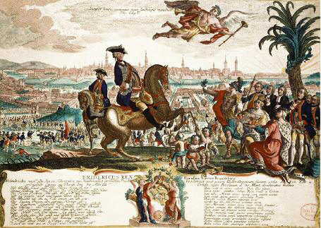 Wie Friedrich II. »der Große« wurde Nach dem Österreichischen Erbfolgekrieg (1740–1748) kam es zur einer „Umkehrung der Allianzen“ (Renversement des alliances). Österreichs klugem Staatskanzler Wenzel Anton Kaunitz gelang es mit Friedrichs des Großen unfreiwilliger Hilfe, die drei kontinentalen Großmächte für ein Bündnis gegen Preußen zu schmieden. Obwohl Österreich, Frankreich und Russland noch keine Kriegsvorbereitungen getroffen hatten, fürchtete Friedrich einen Dreifrontenkrieg und entschied sich zu einem Präventivschlag. Der Dritte Schlesische Krieg, der Siebenjährige Krieg, hatte begonnen. Friedrich der Große marschierte am 29. August 1756 in das neutrale Sachsen ein, schloss die sächsische Armee bei Pirna ein und zwang sie zur Kapitulation. Als er am 1. Oktober bei Lobositz an der Elbe auf eine den Sachsen zur Hilfe eilende österreichische Armee stieß, konnte er nur mit Müh und Not einen Achtungserfolg erringen und musste erkennen, dass er nicht mehr die „alten Österreicher“ vor sich hatte. Während Großbritannien und Frankreich in Nordamerika um die koloniale Vorherrschaft kämpften, trat der Krieg in Europa in seine heiße Phase. Kaunitz erreichte von Frankreich ein Offensivbündnis, dem auch Schweden, das eine wichtige Position in Vorpommern innehatte, beitrat, und Anfang 1757 wurde der Reichskrieg gegen Preußen erklärt. Demgegenüber hatte Friedrich nur Großbritannien, Braunschweig, Hessen und Sachsen-Gotha auf seiner Seite. Im Bemühen, Österreich zu besiegen, stellte sich Friedrich Anfang Mai 1757 dem Gegner vor Prag, konnte aber nur einen Pyrrhussieg erringen. Doch Feldmarschall Leopold Joseph Graf von Daun, auf den Maria Theresia ihre letzte Hoffnung setzte, sammelte nochmals eine Armee und rückte auf Prag vor. Friedrich griff die Entsatzarmee trotz eigener Unterlegenheit an, erlitt aber infolge der klugen Taktik Dauns am 18. Juni bei Kolin seine erste schwere Niederlage. Der König befand sich in einer denkbar ungünstigen Lage. Seine schwer dezimierte Armee musste den Rückzug nach Norden antreten, Prinz Karl von Lothringen, der Schwager Maria Theresias, drang nach Schlesien ein, während von Westen Franzosen und Reichstruppen gegen Friedrich vorrückten. Erst im Spätherbst bot sich dem König die sehnsüchtig erwartete Chance zur Schlacht. Als die Reichstruppen und Franzosen in Richtung Leipzig vorrückten, schlug er sie vernichtend bei Rossbach, wobei Reitergeneral Friedrich Wilhelm Freiherr von Seydlitz-Kurzbach die Schlacht entschied. Mit diesem Sieg war sein Ansehen in weiten Teilen der deutschen Fürstentümer wieder hergestellt. Nun galt es, die österreichische Armee unter Prinz Karl, die inzwischen Breslau erobert hatte, zu besiegen. Mit beispielloser Kühnheit überraschte er die doppelt so starken, aber unvorsichtigen Österreicher, die beim Dorfe Leuthen Stellung bezogen hatten, am 5. Dezember und errang dank der „schiefen Schlachtordnung“ seinen größten Sieg. Mit diesem Triumph, der selbst von Napoleon Bonaparte bewundert wurde, erlangte Friedrich zwar operative Handlungsfreiheit, doch die endgültige Entscheidung stand noch aus. Österreich, Frankreich und Russland waren noch immer zahlenmäßig stark überlegen, und nun lief Friedrich Gefahr, in einen Ermattungskrieg zu geraten, dem er früher oder später erliegen musste. Er nutzte den Vorteil der „inneren Linie“, indem er schneller als der Gegner Kräfte an einer bestimmten Stelle zusammenzog und damit örtliche Überlegenheit gewann. Indem er seine Hauptarmee immer nur auf einen Gegner richtete, trachtete er nach einem entscheidenden Sieg. Dann wäre er auch stark genug, um mit den übrigen Gegnern fertigzuwerden. Sein Motto lautete: „Wenn man alles defendieren will, defendieret man gar nichts.“ Er nahm daher die Besetzung Ostpreußens durch den russischen General Wilhelm Graf von Fermor hin, da er endlich die Österreicher unter Daun in Mähren besiegen wollte. Der König schloss die Festung Olmütz ein, doch als Daun, der „Meister der Verteidigung“ anrückte, schaffte es Friedrich nicht, ihn zur Schlacht zu stellen. Im Gegensteil: Durch kühne Manöver des Generals Gideon Ernst Freiherr von Laudon, dem damals fähigsten österreichischen Heerführer, kam er in arge Bedrängnis, da dieser die Nachschubkolonnen der Preußen mehrmals dezimierte. Dann trat die größere „russische Gefahr“ in Erscheinung, da General Fermor durch Polen heran marschierte und bei Zorndorf nördlich von Küstrin Stellung bezog. Friedrich wandte sich mit dem Gros seiner Armee gegen ihn und griff ihn am Morgen des 25. August an. Als der Angriff scheiterte, wollte Friedrich die Wende erzwingen und schritt seinen Soldaten mutig voran. General Seydlitz konnte zwar die Lage retten, doch der Kampf endete beiderseits mit Erschöpfung. Da Fermor nach zwei Tagen sein Lager abbrach, buchte Friedrich den Sieg für sich. Nun wollte der König die Österreicher schlagen und wandte sich nach Sachsen, um in Schlesien die Verbindung mit den Truppen seines Bruders Heinrich, des „Feldherrn ohne Fehler“, aufzunehmen. Als Friedrich mit 30.000 Mann bei Hochkirch lagerte, wurde er von den Österreichern, bei denen Laudon die Initiative ergriffen hatte, in der Nacht zum 14. Oktober umstellt und bei Tagesanbruch angegriffen. Friedrich konnte sich mit letzter Kraft den Rückzug nach Westen erkämpfen, verlor aber fast ein Drittel seiner Armee, darunter die Feldmarschälle Moritz Prinz von Anhalt-Dessau und Jakob von Keith. Aus unerklärlichen Gründen verzichtete Daun auf die Verfolgung. Im Frühjahr 1759 nahm die Lage hochdramatische Züge an, denn der Mehrfrontenkrieg tat seine Wirkung. Es gab immer weniger Ersatz für die Armee, so dass der König junge Männer mit List und Gewalt rekrutieren ließ, während Söldner die ärgsten Lücken stopften. Er lud Sachsen und Mecklenburg hohe Kriegslasten auf und schreckte zeitweise auch vor Geldentwertung nicht zurück. Trotz allem blieb ihm die