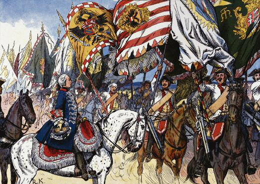 Rückkehr in Österreichs Erbfolgestreit Mit dem Separatfrieden von Berlin war 1742 der Erste Schlesische Krieg beendet worden, aber der Österreichische Erbfolgekrieg ging weiter. Nachdem Preußens Nachbar und Rivale Sachsen 1743 an der Seite Österreichs in den Erbfolgekrieg eingetreten war, griff auch Friedrich der Große 1743 wieder ein. Der Zweite Schlesische Krieg hatte begonnen. Nach dem Ersten Schlesischen Krieg hatte Friedrich der Große seine Armee verstärkt. Er inspizierte häufig seine Truppen und stellte neue Verbände auf, darunter sechs Füsilierregimenter in Schlesien. Diese Verbände waren wie die übrige Infanterie bewaffnet, bestanden aber ab 1741 aus Kleinwüchsigen. Des Weiteren vermehrte er die Husaren um zwei Regimenter. Seine Erfahrungen hatten ihn gelehrt, wie wertvoll die leichte Kavallerie war, wo doch die Österreicher bei den Husaren eine große Überlegenheit besaßen. Es war General Hans v. Zieten, der mit der Zeit seine Totenkopfhusaren zu einer ebenbürtigen Truppe machte. Die Kavallerie zählte nun über 29.000 Mann, während die Infanterie 94.000 Mann umfasste. Als im Österreichischen Erbfolgekrieg (1740–1748) Sachsen Ende 1743 an die Seite von Preußens Gegner im Ersten Schlesischen Krieg Österreich trat, befürchtete Friedrich dahinter eine konspirative Drohung und schloss am 5. Juni 1744 mit Österreichs Kriegsgegner Frankreich, mit dem er bereits im Ersten Schlesischen Krieg verbündet gewesen war, erneut ein Bündnis, obwohl er ahnte, dass ihm die Franzosen im Kriege die Hauptlast aufbürden würden. Nachdem die Österreicher ins Elsass vorgerückt waren, erzwang Friedrich Ende August durch Drohungen den Durchzug durch Sachsen und drang ohne Widerstand bis Prag vor, das am 19. September kapitulierte. Dann schwenkte die preußische Hauptarmee nach Süden und marschierte in den Raum Budweis, doch der Stoß ging ins Leere. Die Österreicher wollten Böhmen keineswegs kampflos preisgeben, und so gingen die Truppen des Prinzen Karl von Lothringen, des Schwagers Maria Theresias, gegen die Nachschublinien der Preußen vor, während leichte Verbände ihre Transportkolonnen dezimierten. Friedrich bemühte sich zwar, die Österreicher zur Schlacht zu stellen, doch Prinz Karl wich klugerweise aus. Die preußische Armee litt immer mehr unter Versorgungsmängeln, und im Spätherbst stieß obendrein ein sächsisches Korps mit 20.000 Mann zu den Österreichern. Friedrich blieb nichts anderes übrig, als sich hinter die Elbe zurückzuziehen, wo er überwintern wollte. Doch die Österreicher setzten nach, überschritten die Elbe bei Kolin und bedrohten Friedrichs Route nach Schlesien. So musste sich der König entschließen, die Armee, die durch Seuchen, Krankheiten und Desertionen arg geschwächt war, nach Schlesien zurückzuziehen. Erschwerend kam hinzu, dass viele Landesbewohner, die er während des Feldzuges in Mähren in die Armee gepresst hatte, in hellen Scharen desertierten. Von der Prager Garnison von 17.000 Mann erreichte nur ein Bruchteil Schlesien. Im Januar 1745 traf die Armee stark dezimiert in Schlesien ein, wo sie begann, die Bevölkerung auszuplündern. Die Exzesse der Soldaten riefen eine Flut von Klagen hervor. Besonders der Adel übte Kritik an der Kriegspolitik Friedrichs und den Vorgängen in Schlesien. Die Disziplinlosigkeiten nahmen bedenklich überhand, so dass Friedrich unverzüglich eingreifen musste. Er ging sogar so weit, dem Hof in Wien Friedensverhandlungen anzubieten, doch diese scheiterten an Maria Theresias Forderung nach der Rückgabe Schlesiens. Erschwerend trat hinzu, dass der König kaum mehr mit einer Entlastung durch Frankreich rechnen konnte, da man in Versailles anderes im Kopf hatte, als ihm aus der Patsche zu helfen. Auch von Bayern war keine Hilfe zu erwarten. Nachdem der Kaiser aus dem Hause Wittelsbach Karl VII. gestorben war, schloss sein Sohn, Kurfürst Maximilian III. Joseph, im April 1745 Frieden mit Österreich und anerkannte die Pragmatische Sanktion. Nun ging Österreich, das mit England, Sachsen und den Niederlanden verbündet war, zum Angriff gegen Preußen über, da es nun namhafte Kräfte frei hatte. Prinz Karl überschritt mit einer starken Armee Ende Mai das Riesengebirge bei Trautenau, doch Friedrich war darauf vorbereitet. Er wollte den Gegner, bevor er noch in Schlesien Fuß gefasst hatte, zur Schlacht stellen. Als die Österreicher und Sachsen bei Hohenfriedberg lagerten, trat er am Morgengrauen des 4. Juni zum Angriff an. Nach einem Schlag gegen die Sachsen stieß er gegen das Zentrum der Österreicher vor. Eine wuchtige Attacke der Ansbach-Dragoner führte zum Sieg. Friedrich hatte mit relativ geringen Verlusten einen großen Erfolg errungen, doch die Entscheidung des Kriegs war noch keineswegs gefallen. Friedrich folgte dem Gegner, der nach Böhmen zurückwich, und wurde am 30. September bei Soor südlich von Trautenau völlig überraschend zur Schlacht gezwungen. Prinz Karl hatte bei Tagesanbruch eine vorteilhafte Stellung besetzt, und schon schwärmten die österreichischen Husaren im Rücken des preußischen Lagers, doch Friedrich reagierte spontan, formierte eiligst seine Regimenter und schritt selbst zum Angriff. Nach verlustreichem, schwerem Ringen stürmten seine Truppen frontal die Höhenstellungen des Gegners und errangen den Sieg. Allerdings ließen die Österreicher und Sachsen noch nicht locker und gingen noch einmal zum Angriff über, um Friedrich den Rückzug nach Brandenburg abzuschneiden. Doch der König gewann am 23. November das Gefecht von Katholisch-Hennersdorf östlich von Görlitz, und eine zweite Armee, die der Alten Dessauer herangeführt hatte, besiegte die Sachsen bei Kesselsdorf westlich von Dresden. Trotz dieser Siege leitete Friedrich Friedensverhandlungen ein. Die Staatskassen waren leer, und ein Winterfeldzug kam für ihn nicht in Frage. Zu seinem Glück stimmte der Hof in Wien zu, da auch der britische Hof dazu drängte und man alle Kräfte zum Kampf gegen Frankr