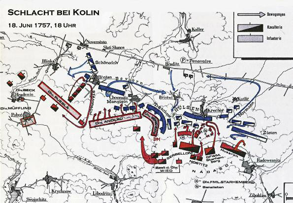 Friedrichs II. erste schwere Niederlage Im Siebenjährigen Krieg stand Friedrich der Große einer Koalition unter Führung der kontinentalen Großmächte gegenüber. Um das Habsburgerreich für einen Separatfrieden gefügig zu machen und so aus der feindlichen Allianz herauszubrechen, marschierte er nach der Eroberung Sachsens im April 1757 mit vier Armeeabteilungen in Böhmen ein. Auf der Gegenseite plante Prinz Karl von Lothringen, der Schwager Maria Theresias und Befehlshaber der Österreicher, gegen die Lausitz vorzustoßen und dann gemeinsam mit den Verbündeten zu operieren. Die österreichische Armee war inzwischen von Feldmarschall Graf Leopold Daun, einem Meister der Verteidigung, neu organisiert worden. Vor Prag stießen die Armeen aufeinander. In der nun folgenden Schlacht von Prag vom 6. Mai 1757 errang Friedrich zwar einen beachtlichen Sieg, da er einen starken Gegner aus einer vorbereiteten Stellung warf. Doch die Verluste von über 14.000 Mann waren schwer zu ersetzen. Prinz Karl ließ sich in Prag einschließen und sandte einen Hilferuf nach Wien, in dem er die Kaiserin um Entsatz bat. König Friedrich befand sich in keiner beneidenswerten Lage. Angesichts der starken Besatzung der Stadt konnte er keinen Sturmangriff wagen; er stellte sich auf eine längere Belagerung ein, für die zunächst ausreichend Artillerie herangebracht werden musste. Ein derartiges Vorhaben war aber ein großes Wagnis, da er mit einem Entsatzversuch rechnen musste und obendrein Meldungen von der Annäherung einer französischen Armee eintrafen. Inzwischen hatte Maria Theresia den erfahrenen Feldmarschall Daun mit dem Entsatz von Prag beauftragt. Sie ließ ihn wissen, dass das Schicksal ihres Reiches und ihrer Dynastie von seiner Führungskunst abhinge. Daun sammelte zahlreiche Versprengte und zog wieder eine ansehnliche Armee südöstlich von Prag zusammen, während Husarenabteilungen unter General Franz Leopold Graf Nádasdy den Rücken der Belagerer bedrohten. So fasste der König, obwohl er zahlenmäßig im Nachteil war, den kühnen Entschluss, die Entsatzarmee zur Schlacht zu stellen. Er ließ Truppen unter Feldmarschall James Keith zur Einschließung Prags zurück und zog mit 34.000 Mann und 90 Geschützen nach Osten in Richtung Kolin, wo er Daun zu stellen hoffte. Dieser hatte inzwischen etwa zehn Kilometer westlich der Ortschaft parallel zur „Königstraße“ eine gute Höhenstellung gewählt und dort seine Armee in der Stärke von 50.000 Mann mit 145 Geschützen postiert. In Reserve standen noch einige Regimenter sächsischer Reiterei, die sich in Reaktion auf die schlechte Behandlung Sachsens durch Friedrich auf die Seite der Österreicher geschlagen hatten.
