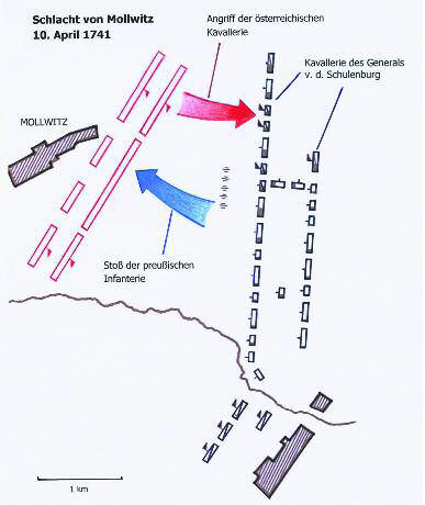 Tagelang ziehen die Gegner auf dem gefrorenen Boden aneinander vorbei. Die Aufklärer der Preußen werden von den österreichischen Panduren abgefangen, so dass der König im Ungewissen bleibt. Erst der Ritt von Friedrichs Generaladjutanten Heinrich von Saldern, den er zu Erkundung entsandt hat, bringt brauchbare Nachrichten über den Standort der Österreicher. Die Felder rund um Mollwitz sind noch immer schneebedeckt, als Friedrich am 10. April die Schlacht sucht. Er nähert sich von Osten, wogegen die Österreicher in Nordwesten stehen. Da der König nach den Exerziergewohnheiten vorgeht, verzögert sich der Aufmarsch der Infanterie. Erst kurz nach Mittag haben die Regimenter endlich ihre Stellungen eingenommen. Doch die Gegenseite ist nicht untätig geblieben. Die überlegene österreichische Reiterei unter General Karl Joachim Freiherr von Römer geht, ohne den Aufmarsch der eigenen Infanterie abzuwarten, gegen den rechten Flügel der Preußen vor, der aus Kavallerie gebildet wird und unter dem Befehl des Generals Friedrich Graf von der Schulenburg steht. Trotz heftigen Artilleriefeuers reiten die Österreicher eine wuchtige Attacke und nützen den Vorteil, dass der Gegner noch nicht Position bezogen hat. Schulenburgs Kavallerie wird durchbrochen, der General unternimmt einen Gegenangriff und fällt im Gefecht. Die österreichische Reiterei umgeht das erste Infanterietreffen der Preußen und kann erst dann von den Bataillonen des Prinzen Leopold von Anhalt-Dessau, der das zweite Treffen befehligt, zurückgeworfen werden. Bei diesem Kampf fällt auch General Römer. Als auch der linke Flügel der Preußen durchbrochen wird, scheint es, als ob die Schlacht verlorengehe. Feldmarschall v. Schwerin und auch andere Offiziere sorgen sich um die Person des Königs und ersuchen ihn dringend, sich in Sicherheit zu bringen, um neue Truppen aufzubieten. Der junge König verlässt das Schlachtfeld, ohne die Gefahr richtig einzuschätzen. Nun aber tritt die preußische Infanterie in Aktion. Sie rückt in eingeübtem Drill vor, feuert in geschlossenen Formationen, wie sie es auf dem Exerzierplatz geübt hat, ähnlich einem Uhrwerk. Sie treibt die hauptsächlich aus jungen Rekruten bestehende österreichische Infanterie vor sich her, die sich verängstigt um ihre Geschütze schart. Die Unsicherheit der Rekruten ist so groß, dass sie beim Hantieren sogar ihre Ladestöcke zerbrechen. So rettet das disziplinierte preußische Salvenfeuer den Tag. Nachdem Friedrich am nächsten Morgen benachrichtig worden war, kehrte er sofort zur Armee zurück. Preußen hatte mit 4.849 nur unwesentlich mehr Tote und Verwundete zu beklagen als der Gegner mit 4.551, doch konnte dieser erste Sieg unter seiner Herrschaft dem König nicht recht gefallen. Der Rat, das Schlachtfeld zu verlassen, hatte ihn in eine peinliche Lage gebracht, und sein Verhalten wurde später als Flucht bezeichnet. Nichtsdestoweniger hat Friedrich aus Mollwitz richtige Schlüsse gezogen. Er vermied eine weitere Schlacht, ging an die Ausbildung der Kavallerie, verbesserte vor allem ihr Attackieren und brachte der Artillerie größere Beweglichkeit bei. Er selbst führte ein spartanisches Leben, trat bereits um 4 Uhr morgens seinen Dienst an und unternahm einen Lagerrundgang. Er ließ sogar persönlich sein Gardebataillon trotz Schneefalls exerzieren. Manneszucht und Gehorsam standen an erster Stelle der Eigenschaften, die er von seinen Soldaten verlangte, Eigenschaften, die in der Folge den Charakter der preußischen Armee prägen sollten und nicht selten zum Sieg beitrugen. Da er auch von seinen Offizieren derartige Eigenschaften und obendrein noch Fortbildung erwartete, nahmen zahlreiche ihren Abschied. Nach Mollwitz kam es in Schlesien zu keiner weiteren Schlacht mehr, denn Friedrich zog eine diplomatische Lösung vor. Obwohl der König Anfang Juni den Nymphenburger Vertrag mit Frankreich und Bayern geschlossen hatte, der die Niederlage des Habsburgerreiches zum Ziel hatte, suchte er die Verständigung mit Maria Theresia. Diese willigte ein, da sie ihre Truppen vor allem zum Kampf gegen Frankreich brauchte, und schloss mit Friedrich am 9. Oktober 1741 den Vertrag von Kleinschnellendorf bei Neiße, der Schlesien in preußischem Besitz beließ. Die nun folgende Friedenszeit nutzte der König, um die Ausbildung seiner Armee zu verbessern. Dies sollte sich in den nächsten Kriegen auszahlen.