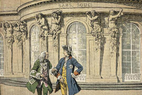 Wo der Alte Fritz Ruhe und Erholung fand Die Jahre auf Schloss Rheinsberg waren die glücklichsten im Leben Friedrichs des Großen. Nach gescheiterter Flucht und der Anklage wegen „Hochverrats“ vom Vater wieder in Gnade aufgenommen, verbrachte der Kronprinz hier eine unbeschwerte Zeit im Kreis von geistreichen und amüsanten Freunden. Schon damals dachte er daran, ein Stück dieses sorgenfreien Lebens mitzunehmen, wenn er dereinst die Lasten der Königskrone tragen würde. Seinen Traum von einem „Sans souci“ sollte ihm einer der Rheinsberger Kameraden erfüllen: Georg Wenzeslaus von Knobelsdorff. Wie die meisten Söhne des preußischen Adels war von Knobelsdorff zum Offizier erzogen worden. Als er an einem Lungenleiden erkrankte, schied er aus dem Militärdienst aus und widmete sich der Architektur und Malerei. Der Autodidakt wurde zum bedeutendsten Baumeister der friderizianischen Epoche. Gleich nach seinem Regierungsantritt ernannte ihn Friedrich zum „Surintendanten aller Königl. Schlösser, Häuser und Gärten (und) Directeur en chef’ aller Bauten in den sämtlichen Königl. Provinzen“. So gewaltig wie der Titel waren auch die Aufgaben von Knobelsdorffs. Der rastlose König überhäufte ihn mit Arbeit, und es konnte ihm nie schnell genug gehen. „Faul ist er wie ein Artilleriepferd“, schimpfte er in einen Brief über seinen Leibarchitekten. Nach Aufträgen für das Forum Friderizianum und die Umgestaltung des Tiergartens betraute ihn Friedrich mit seinen Lieblingsprojekt: dem Bau eines „Lust-Hauses zu Potsdam“, genannt „Sanssouci“, auf einem Weinberg vor den Toren Berlins. Die ersten Skizzen dafür hatte der König schon in Rheinsberg zu Papier gebracht. Friedrich war alles andere als ein bequemer Bauherr. Immer wieder gab es Missstimmungen zwischen ihm und dem Architekten. Von Knobelsdorff wollte das Rokoko-Schlösschen durch einen Sockel erhöhen, um ihm optisch mehr Gewicht zu verleihen und es repräsentativer erscheinen zu lassen. Friedrich bestand auf einem ebenerdigen Gebäude ohne Kellergeschoss. Er wollte durch Terrassentüren direkt hinaus in die Natur treten können und änderte die Entwürfe rigoros. Der Eigensinn des Königs rächte sich. Besucher klagten darüber, dass es in dem „maison de plaisance“ ausgesprochen zugig und fußkalt sei. Ärzte begründeten Friedrichs Anfälligkeit für Erkältungen und sein Rheuma mit der mangelnden Isolierung des Schlosses. Am 14. April 1745 wurde der Grundstein gelegt, zwei Jahre später, am 1. Mai, fand die Einweihung statt, obwohl noch nicht alle der zwölf Räume fertig waren. Friedrich beanspruchte ohnehin nur fünf im Ostflügel für sich. Die übrigen im Westflügel dienten als Gästezimmer für seine ausschließlich männlichen Besucher, denn „Sanssouci“ sollte auch „sans femmes“ sein. Der König lebte hier von April bis Oktober, je nach Witterung. War er im Krieg, hatte er nichts dagegen, dass sich interessierte Untertanen seine Wohnung anschauten. Die Liebe zu Rheinsberg, das Friedrich „Remusberg“ nannte, spiegelt sich an vielen Stellen in „Sanssouci“ wider. Zu seinen Skizzen für die geschwungene Kolonnade mit 88 griechischen Säulen wies er an: „Corienthien, le reste comme à Remusberg“. Die Bibliothek erinnert in ihrer runden Form an das Turmzimmer auf Schloss Rheinsberg, die beiden Sphyngen sind denen in Rheinsberg nachgebildet. Bei der Ausstattung seines Sommerschlosses sparte der sonst so knauserige König nicht. Aus Carrara ließ er Marmor für Fußboden und Wände kommen, die Decken sind reich bemalt, die Wände verspiegelt und mit edlen Hölzern vertäfelt und die Böden mit Intarsien geschmückt, wie es das Rokoko verlangt. Das 97 Meter lange und zwölf Meter hohe Bauwerk mit der grünen Mittelkuppel, die in goldenen Lettern die Inschrift „Sans, Souci“ trägt, war ganz auf die Bedürfnisse einer Person abgestimmt. Nur der unterkühlt wirkende Marmorsaal mit Säulen und Gesimsen und das reich geschmückte Empfangszimmer dienten repräsentativen Zwecken, während die königliche Wohnung mit Arbeits-, Schlaf- und Konzertzimmer im Ostflügel eine private Atmosphäre ausstrahlte. Friedrichs „privatissime“ war die Bibliothek mit raumhohen Fenstern und einem strahlenförmig gelegten Parkett. Der riesige Kamin – Friedrich verzichtete auf die damals üblichen Kachelöfen – machte den Lieblingsraum des Königs zu einem gemütlichen Lesekabinett. Die Glasvitrinen waren voll gestopft mit Büchern und bibliografischen Kostbarkeiten. An warmen Tagen dinierte der König gern im Marmorsaal oder auf der Terrasse und genoss den Blick auf Wiesen, Rondelle und Wasserspiele des üppig mit Marmorstatuen und Büsten geschmückten Landschaftsparks. Den Tee nahm er mit seinen Gästen im chinesischen Teehaus, das 1754 bis 1759 entstand. Friedrich wollte in seinem geliebten Lustschlösschen nicht nur leben, sondern auch begraben sein. Er verfügte: „Man bestatte mich in ,Sanssouci‘ auf der Höhe der Terrassen in einer Gruft, die ich mir habe herrichten lassen … Sterbe ich in Kriegszeiten oder auf der Reise, soll man mich am ersten besten Ort beisetzen und im Winter nach ,Sanssouci‘ an die bezeichnete Stätte bringen.“ Fast 40 Sommer, die Kriegsjahre ausgenommen, verbrachte der Alte Fritz in „Sanssouci“. Im Laufe der Zeit büßte das Schloss an Glanz ein. Der König hielt kostspielige Renovierungen für überflüssig. Nur das „Voltaire-Zimmer“, das der berühmte Literat und Philosoph von 1750 bis 1753 bewohnt und nach einem Streit mit dem König Hals über Kopf verlassen hatte, wurde nach dessen Abreise aufgefrischt. Vermutlich wollte Friedrich nicht mehr an den undankbaren Gast aus Frankreich erinnert werden. Auch der Erbauer von „Sanssouci“ schied im Zorn aus dem Schloss. Zwischen ihm und dem König hatte es immer wieder Meinungsverschiedenheiten gegeben, denn von Knobelsdorff war kein Jasager wie andere in der Umgebung Friedrichs. Als von Knobelsdorff im Alte
