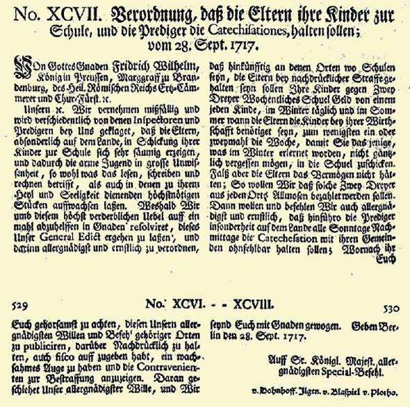Wenn die Schulkommission auch frustriert nach Berlin zurückkehrte, in Preußen lernten immer mehr Kinder lesen und schreiben. 1717 hatte der Vater Friedrich des Großen, Friedrich Wilhelm I., die allgemeine Schulpflicht für Knaben und Mädchen eingeführt. Hintergrund war die Erkenntnis, dass die wachsende Handwerkerschaft Nachwuchs brauchte, der lesen, schreiben und rechnen konnte. Bis dahin war es den Eltern überlassen, ob ihre Kinder etwas lernen sollten. Die Lehrerschaft bestand aus Pfarrern, Theologiestudenten und Feldpredigern.