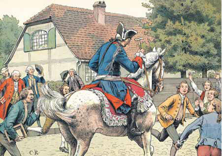 Der König bittet zum Schulbesuch Wer seinen Untertanen Schulbildung ermöglicht, tut mehr für sie, als wenn er neue Gold- und Silberminen fände. Die Worte des Reformators Philipp Melanchthon fielen in der friderizianischen Ära auf fruchtbaren Boden. Schaukelnd bahnte sich die Kutsche ihren Weg durch den Sand der brandenburgischen Landstraßen von Dorf zu Dorf. Die Herren der Abteilung für geistliche Angelegenheiten aus Berlin wurden tüchtig durchgerüttelt. Auf Order Friedrichs des Großen waren sie wochenlang unterwegs, um die Schulen zu visitieren. Was sie vorfanden, war ein Beweis dafür, dass die vom König angeordnete Schulreform noch längst nicht überall angekommen war. In dem Bericht einer Schulvisitation von 1782 heißt es: