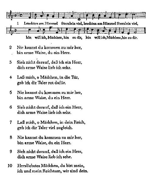 Masurenlied Ach, wieher mein ... Ach mein Gott, der ... Das Feld ist weiß Dort hinterm See Fünf sind wir ... Ging ein Weiblein ... Laßt uns all nach ... Leuchten am Himmel Sternlein Masurenlied Reiter schmuck und fein Pflanzt ein Blumen... Wie schön ist's draußen Zeit zu gehn ist's Der Vogel singt ... Wir kommen herein