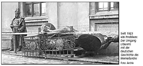 Ich gestehe, daß ich - da auch gar nicht darauf vorbereitet - am liebsten rücklings aus dem Fenster gesprungen wäre. Nachdem ich mich schnell gefaßt hatte, beglückwünschte ich den Museumsdirektor zu der gelungenen Ausstellung, bemerkte dann aber, daß wir, die Memelländer und Litauer, was den 15. Januar 1923 angeht, doch unterschiedlicher Auffassung seien und die Meinungen weit auseinandergingen. Wenn man von einer Angliederung sprechen kann, dann höchstens ab 1945, als die Rote Armee Memel besetzte und somit das gesamte Memelland eroberte. Ich vertrat mit dem Bürgermeister einhellig die Meinung, daß Litauen ohne Memel keine Zukunftsperspektive habe. Im Konferenzsaal des Hotels Klaipeda fand am Nachmittag ab 14 Uhr eine öffentliche Diskussion zum Thema „Klaipeda 1923-2003, Gewinne und Verluste“ statt. Unter der Leitung der Historiker Ceslovas Laurinavicius, Alvydas Nikzentaitis und Vygantas Vareikis kam es zu sehr guten und sachlichen Redebeiträgen. Es war zu keiner Zeit zu befürchten, daß der von C. Laurinavicius zu Beginn geäußerte Wunsch, trotz der wohl unterschiedlichen Auffassungen nicht mit den Fäusten aufeinander loszugehen, nicht in Erfüllung gehen könne, obwohl alle drei Historiker wie auch rund 80 Prozent der Diskussionsteilnehmer von Anfang an die Position von uns Memelländern vertraten, die da lautet, daß es sich um eine Annexion und keinen Aufstand handelte. Um 16 Uhr fand eine Ehrung der Gefallenen am Denkmal für die sogenannten Aufständischen des Jahres 1923 statt. Zum Abschluß des Tages fand man sich um 18 Uhr zu einem Festakt und Konzert im Musiktheater ein. Gestaltet wurde diese Veranstaltung vom Sinfonieorchester sowie dem Chor und den Solisten des Musiktheaters. Bürgermeister Taraskevicius betonte in seinem Grußwort die Bedeutung des Aufstandes von 1923 für das Memelland und Litauen. A. Z. Kaminskas von der litauischen Regierung verlas ein Grußwort des Ministerpräsidenten Algirdas Brazauskas. Wenn denn der 15. Januar 1923 für die Litauer beziehungsweise die Bewohner unseres Memellandes von solch großer Bedeutung ist, frage ich mich, warum weder der Ministerpräsident, der Präsident oder ein anderer hochrangiger Staatsvertreter aus Wilna an dem Jubiläum teilgenommen hat? Ist man sich in Wilna etwa zwischenzeitlich bewußt geworden, daß man keine Angliederung feiern kann, schon gar keine 80 Jahre? Hat man sich im Hinblick auf den EU-Beitritt im Jahre 2004 nun doch auf die historische Wahrheit bezüglich der Geschichte des Memellandes besonnen? Selbst Memels Bürgermeister bemängelte während des Festaktes die mangelnde Aufmerksamkeit der Regierung. In den folgenden Tagen startete man von den Medien eine Umfrage über Sinn und Zweck beziehungsweise das Für und Wider des riesigen Denkmals, das eigens zum Jubiläum an der Börsenbrücke eingeweiht werden sollte. Außer dem riesigen Betonfundament und einer noch größeren Betonumfassung am Dangeufer vor der Börsenbrücke war am Jubiläumstage allerdings noch nichts fertig. Angeblich gibt es Lieferschwierigkeiten mit dem aus China georderten Marmor. Nach einem Tag hatten sich 278 Personen für die Denkmalserrichtung ausgesprochen, und beachtliche 780 Menschen dagegen. Die nächsten Tage erbrachten eine immer größer werdende Gruppe von Bürgern, die sich gegen das Denkmal entschieden. Die Zeitung „Vakaruekspresas“ schreibt in der Ausgabe vom 15. Januar 2003 unter der Überschrift „Werden wir uns unter dem Triumphbogen sicher fühlen?“, daß die heftigen Diskussionen um das neue Denkmal kein Ende fänden, und druckt einen Kommentar von Dainius Elertas zu dem Thema ab. „Ein schöner Rückblick auf die Vergangenheit“, so der Historiker in seinem Zeitungskommentar, „war die Wiedererrichtung des Simon-Dach-Brunnens mit der Statue Ännchen von Tharaus. Seine Fortsetzung bildet die im vergangenen Jahr vor dem Bahnhof aufgestellte Komposition ,Der Abschied‘, die kein Deutschtum deklariert, sondern das historische Bewußtsein fördert. Wertvoll, authentisch ist das Denkmal für die Aufständischen von 1923. Als wahre ,Zeitzeugen‘ im historischen Sinne wertvoll, jedoch vergessen sind das Ehrenmal für die Soldaten des Ersten Weltkrieges sowie die Kreuze auf dem deutschen Soldatenfriedhof. Für die Stadt ist das Ludwig-Hagen-Denkmal wichtig. Den ,Triumphbogen‘ bewerte ich negativ. Meiner Meinung nach deutet die Errichtung solcher gigantischen Denkmäler darauf hin, daß die Bürger der Stadt sich immer noch unsicher fühlen und zu beweisen versuchen, daß das Memelland heute wirklich zu Litauen gehöre.“ Auf der Titelseite dieser Zeitungsausgabe ist unsere Statue „Abschied‘ abgebildet, mit der folgenden Bildunterschrift: „Die im vergangenen Sommer am Bahnhofsvorplatz enthüllte Komposition ,Abschied’ gehört - den Historikern und Künstlern zufolge - zu den gelungensten neuen Denkmälern der Stadt und wurde von den Bürgern der Stadt sehr positiv aufgenommen.“ Ich meine, ein besseres Kompliment können wir nicht bekommen. _____________________________ So sah der