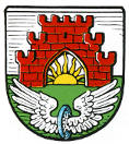 aufgehenden, goldenen Sonne im Torbogen, unten ein silbernes, geflügeltes,