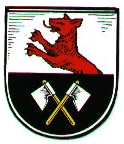 Schild in Silber einen roten wachsenden, springenden Wolf, unten auf schwarzem
