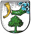 gestürztes goldenes Jagdhorn, darunter steht auf grünem Boden ein grüner