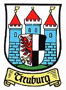 Wappen: In Silber auf grünem Boden eine blaue dreitürmige Burg mit höherem Mittelturm, belegt mit einem gespaltenen Schild,