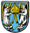 Das Wappen zeigt in Blau eine von zwei schwebenden, weiß gekleideten Engeln getragene, goldene Bischofsmütze mit herabhängenden Bändern.