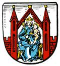 Silber die blaugekleidete, gekrönte Mutter Gottes mit dem Jesuskinde, sie sitzt