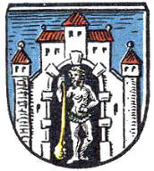 zeigt in Blau eine silberne Burg mit fünf gestaffelten, rotbedachten Türmen. In